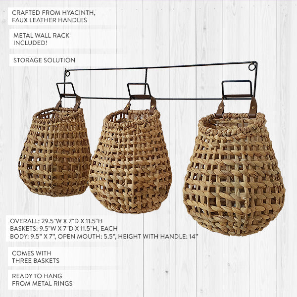 Hyacinth Wall Baskets on Hanging Racks, Set of 3