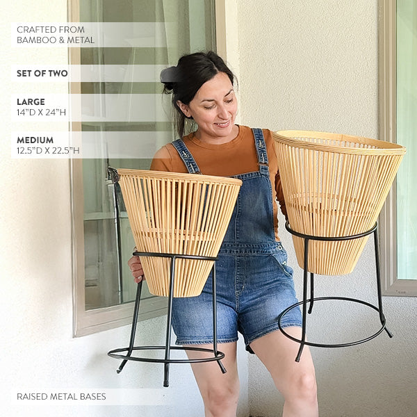 Natural Bamboo Round Planter on Metal Stand, Set of Two
