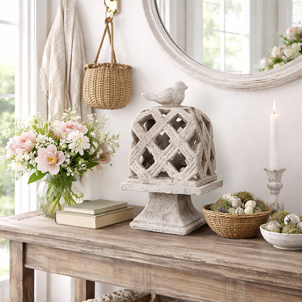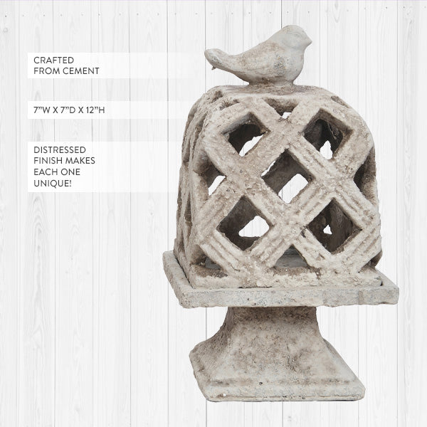 Distressed Cement Bird Lattice Cloche Sculpture on Pedestal