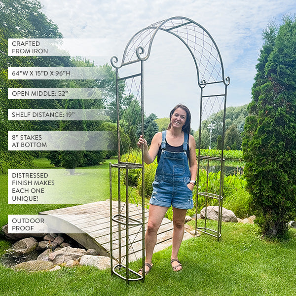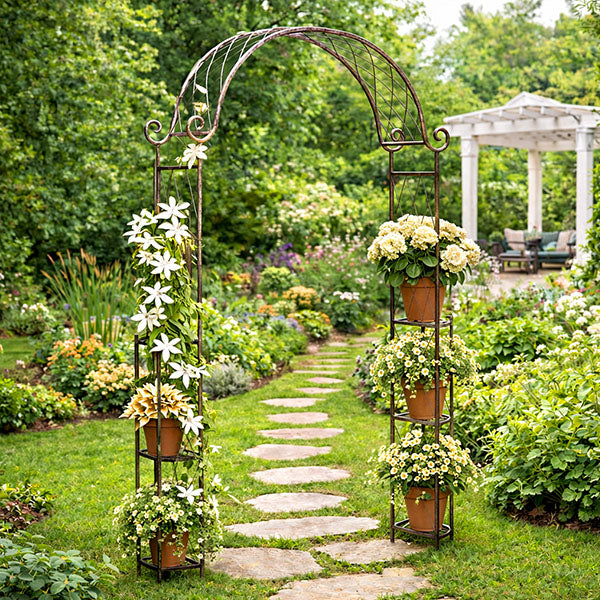 8 Foot Tall Metal Outdoor Garden Arch Trellis with 6 Plant Shelves