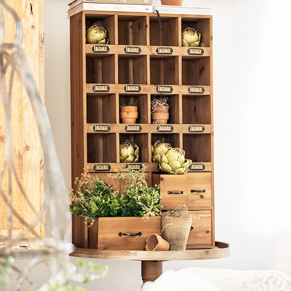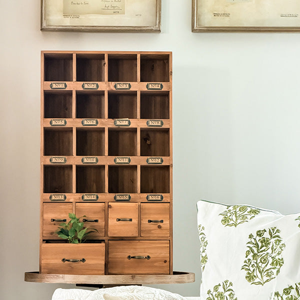 This vintage-inspired apothecary cabinet brings old-world organization to modern life with 16 numbered cubbies (complete with metal label holders) plus 6 functional drawers. The warm natural wood finish and vintage brass-style hardware give it that "I found this at an estate sale" vibe—except this one arrives fully assembled and ready to organize.