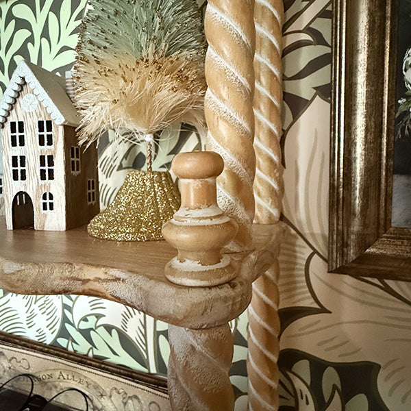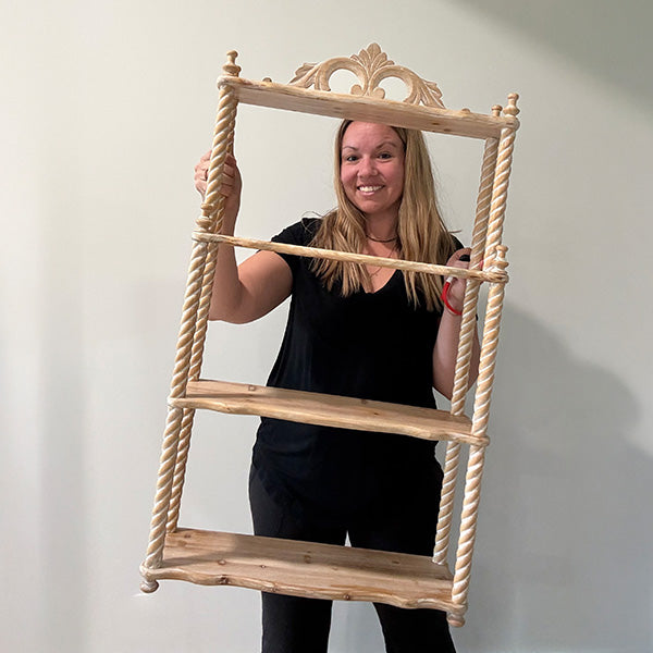 Bring a touch of cottage core charm to your home with this 34-Inch Turned Wood Wall Shelf with Three Shelves. Its beautifully distressed wood and delicate detailing make it a whimsical and functional addition to your space.