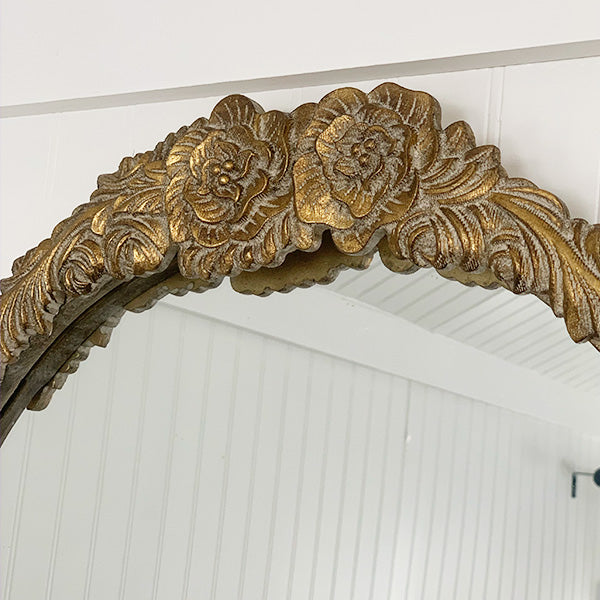 Featuring a hand-carved flora pattern at the top. this antique gold mirror effortlessly combines timeless beauty with impeccable craftsmanship. Its vintage-inspired design. framed with ornate detailing. is the epitome of elegance. Whether you're adorning a hallway. bedroom. or living room. this mirror will instantly elevate your décor. Plus. at such a low price. it's practically a steal!
