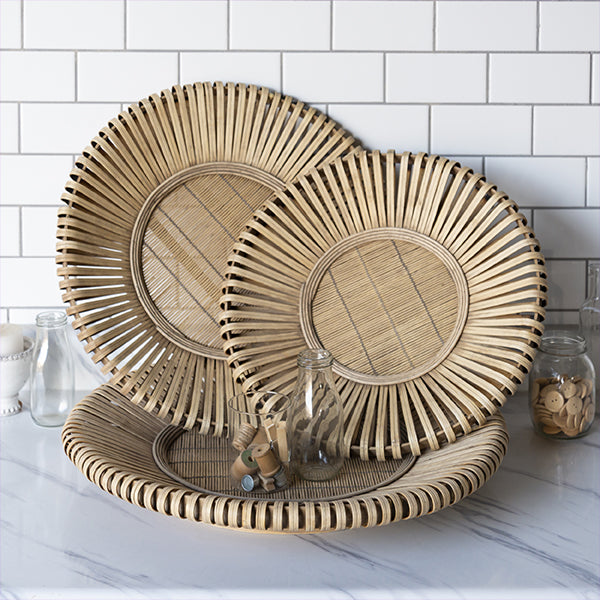 This set of THREE is SUPER unique in design and those neutral hues will compliment your home's décor! Hang this set of bamboo wall baskets above your sofa or up on your mantel in your living room! Hang this on an empty wall in your bathroom. office. or craft room! This will look PERFECT as part of a gallery wall or in your dining room! Place them flat on your dining table as part of a centerpiece!