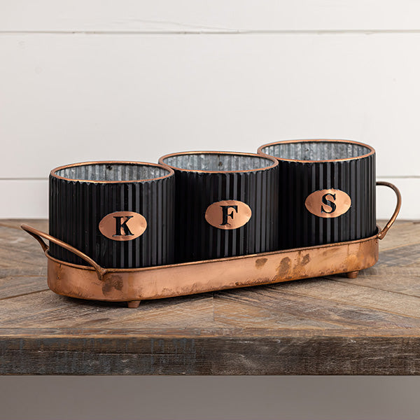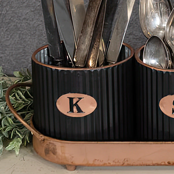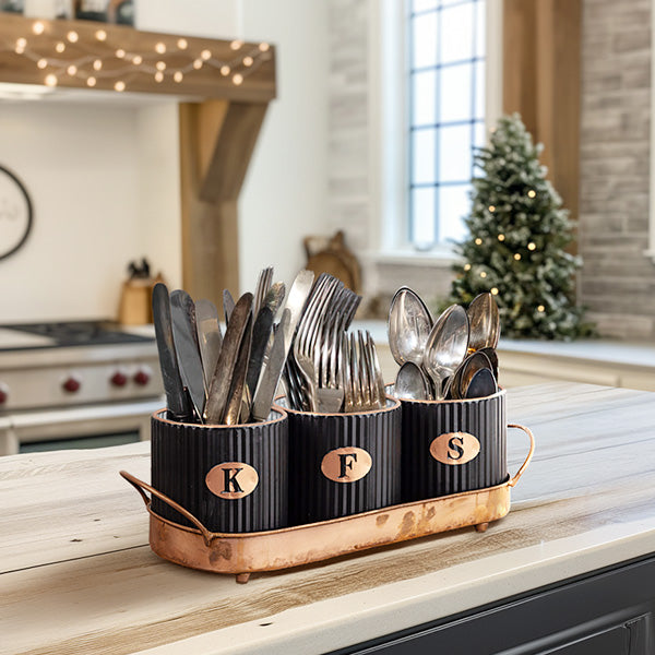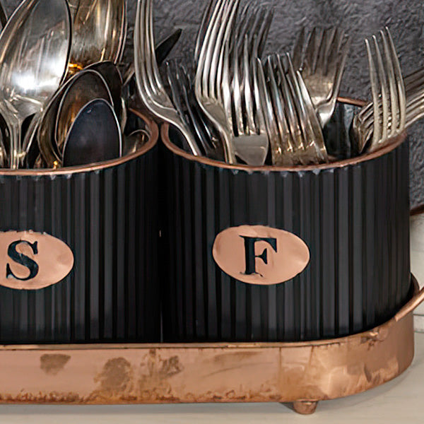 K. F. S.—what's that stand for? Knife. fork. and spoon. of course! This chic Black Metal Canister Set with a gleaming copper tray is here to bring organization and style to your kitchen decor. Perfect for keeping your cutlery sorted and ready to transport. this set is as practical as it is eye-catching.