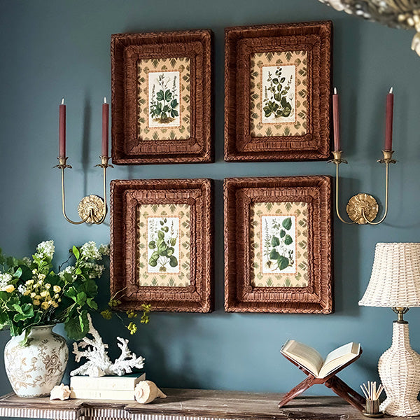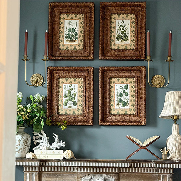 Inspired by 18th-century Weinmann hand-colored botanical engravings. each of the four prints features richly detailed green botanicals on a warm peach background with an ornate border. Earthy. sophisticated. and layered — the kind of piece guests stop and ask about.