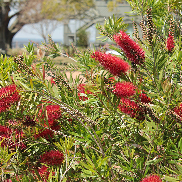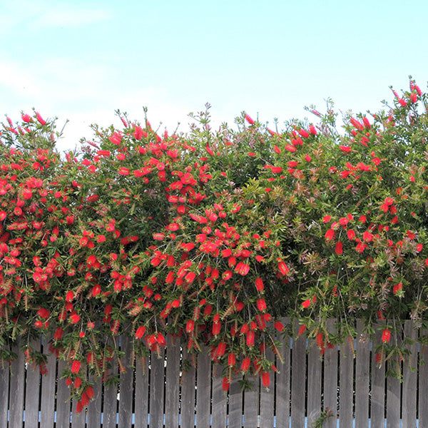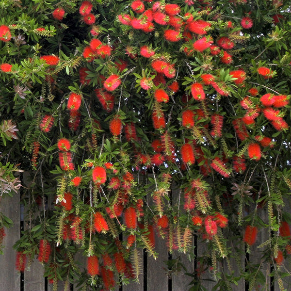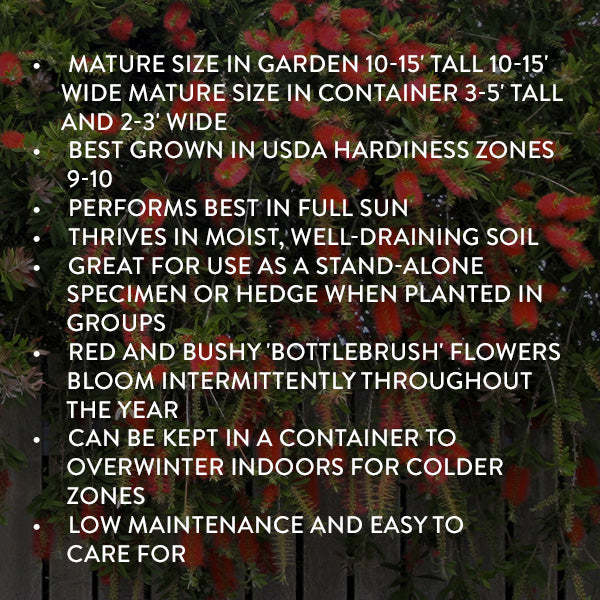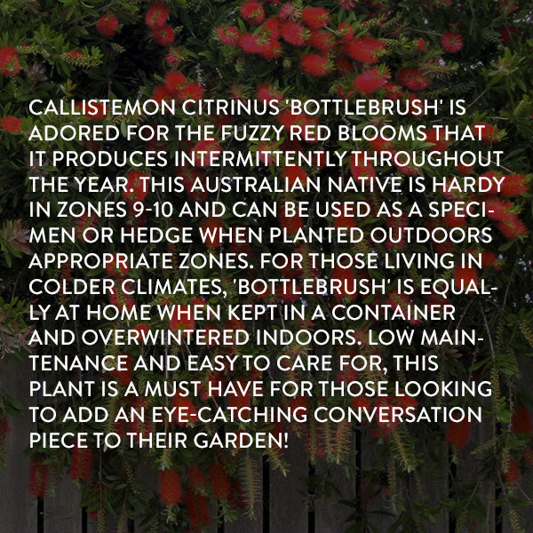 Callistemon citrinus 'Bottlebrush' is adored for the fuzzy red blooms that it produces intermittently throughout the year. This Australian native is hardy in zones 9-10 and can be used as a specimen or hedge when planted outdoors appropriate zones. For those living in colder climates. 'Bottlebrush' is equally at home when kept in a container and overwintered indoors. Low maintenance and easy to care for. this plant is a must have for those looking to add an eye-catching conversation piece to their garden!