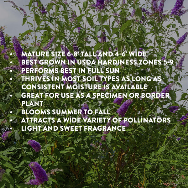 Nothing attracts pollinators to the garden quite like a butterfly bush! 'Black Knight' produces showing deep purple. almost black. flowers in elongated clusters on arching branches. Its bold blossoms and glimmering gray-green foliage creates a dazzling focal point in the garden or on the patio. Flowering continuously from summer to fall. Black Knight provides a steady supply of nectar for butterflies. hummingbirds and evening moths. Plant in a large. decorative container or directly into the garden and enjoy months of color in any sunny setting.