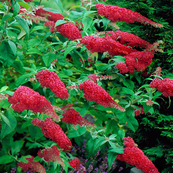 Royal Red bursts into bloom in early summer with deep magenta flower spikes measuring up to 14 inches in length. Commonly known as a butterfly bush. this season-long performer boasts gracefully arching stems. shimmering gray-green foliage. and a sweet honey-like aroma. Royal Red performs throughout the hot summer months. tolerates drought conditions. and draws in pollinators of all types.
