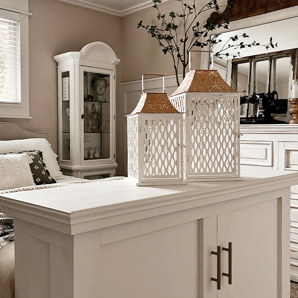Enhance the ambiance of your home with our Large Ornate Caged Metal Candle Lanterns. With their exquisite design. cottagecore decor charm. and practical functionality. they are sure to elevate any space.