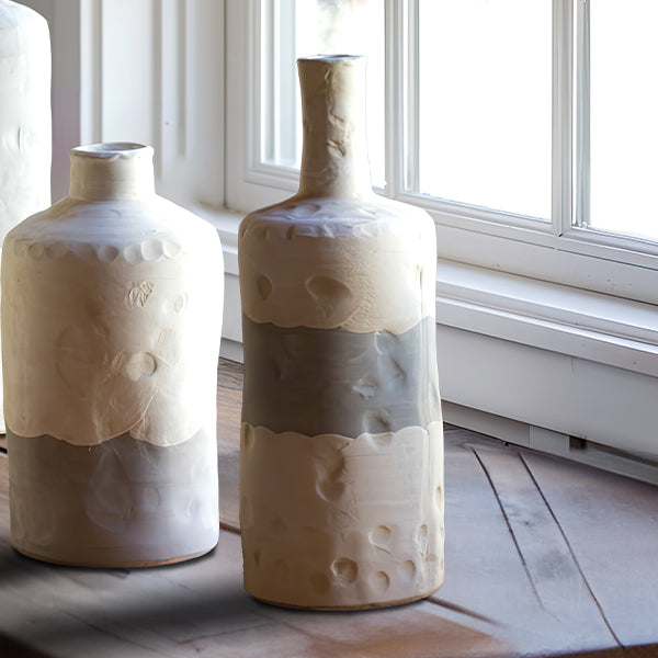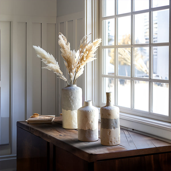 Complete your coastal decor with our Ceramic Bottle Vases. Set of 3. adding a touch of seaside charm to any room. Crafted with sleek designs and versatile shapes. these vases are ideal for showcasing beach-inspired blooms or greenery. Whether arranged as a centerpiece on your dining table or displayed on shelves. these vases bring coastal elegance to your home. infusing your space with the relaxed and breezy atmosphere of coastal living.