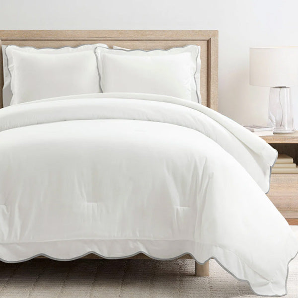 Introducing our gorgeous Chic Scallop Edge Comforter Set! This is the kind of bedding you find in the most beautiful beach houses and designer catalogs. and we are absolutely obsessed. With its crisp white cotton front and a stunning gray scalloped trim. it brings the perfect blend of modern elegance and timeless charm.