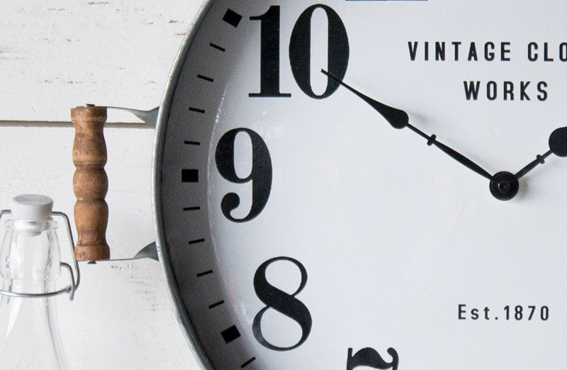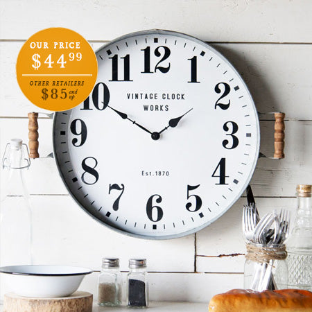 This vintage-inspired tray clock is beyond pretty and the perfect size for your farmhouse cottage! This clock brings to mind old enamel clocks scattered around little old towns in another era! Place this tray clock piece in your living room kitchen bedroom or office to add an extra historic charm!