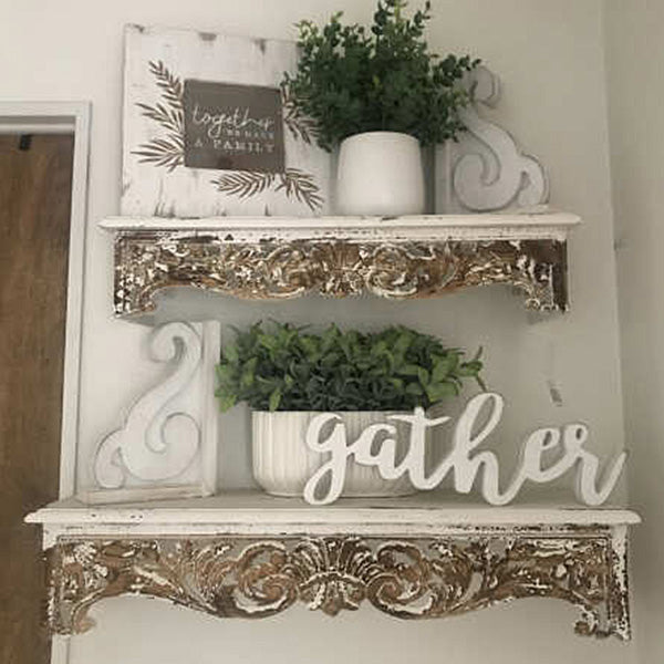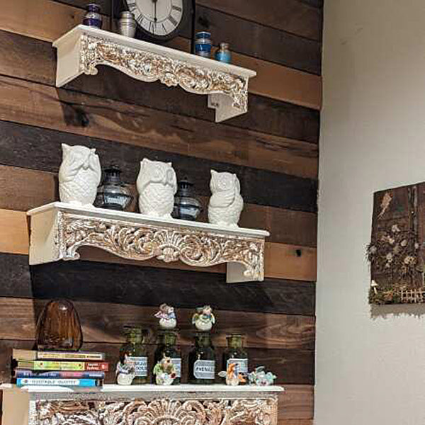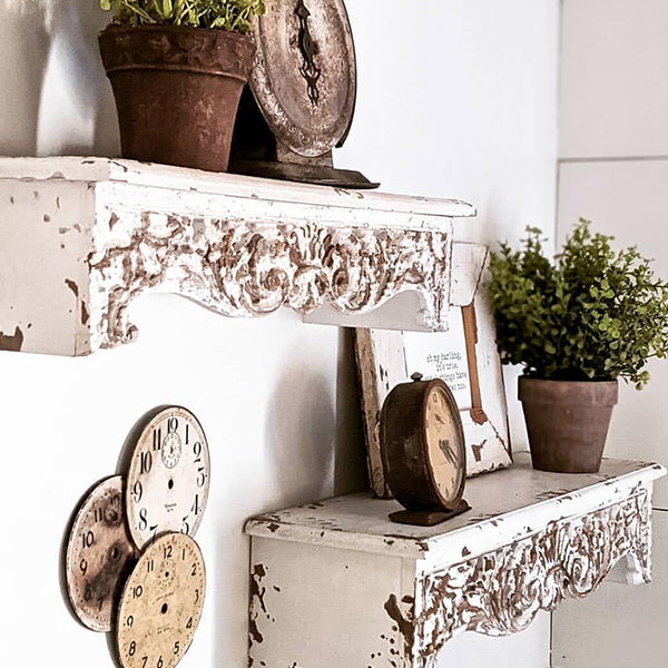 Our hearts are all aflutter with this AMAZING deal we have in store for you today! The farmhouse appeal. the vintage. romantic vibe all wrapped up in one beautiful steal... well actually THREE! We are absolutely LOVING these corbel wall shelves! Plus. this set of ORNATELY carved wall shelves is wayyy cheaper than we have seen at other stores! With WAY more chippy detailing that you love!
