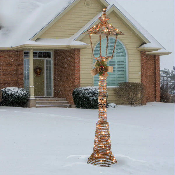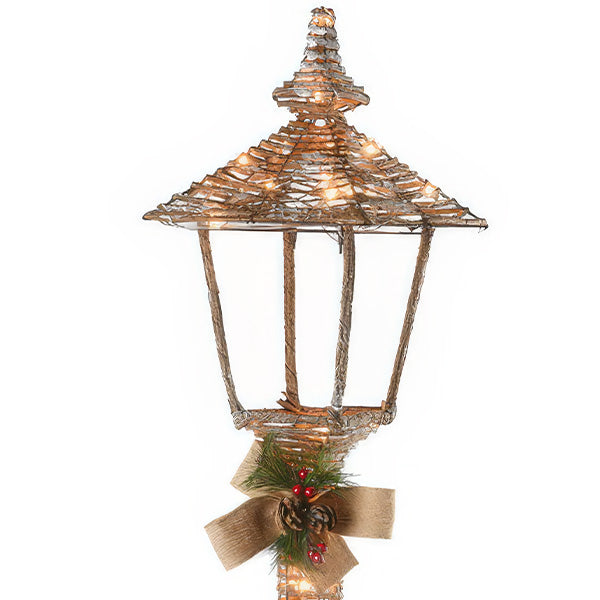 Expertly handcrafted from champagne-colored natural vine. durable metal. soft fabric. and lifelike faux greenery. this lamp post blends organic texture with seasonal sparkle. A classic lantern top is beautifully accented with a burlap bow. natural pine cones. and red berries for an authentic Christmas touch. Inside. 70 pre-strung clear LED lights emit a soft. inviting glow that turns any corner into a festive focal point.
