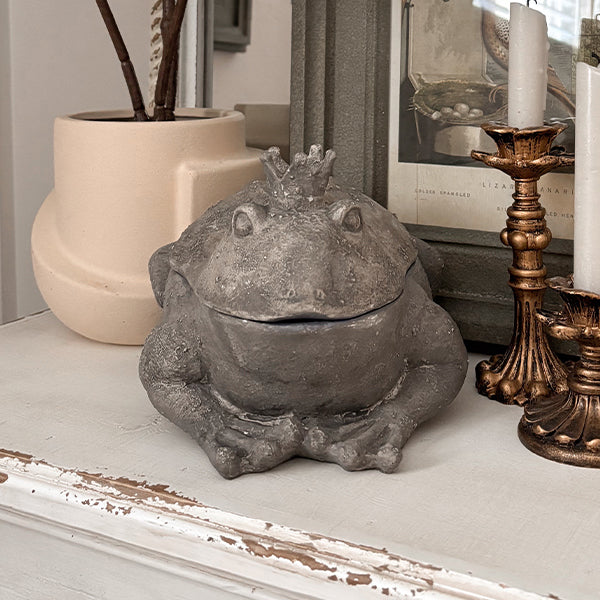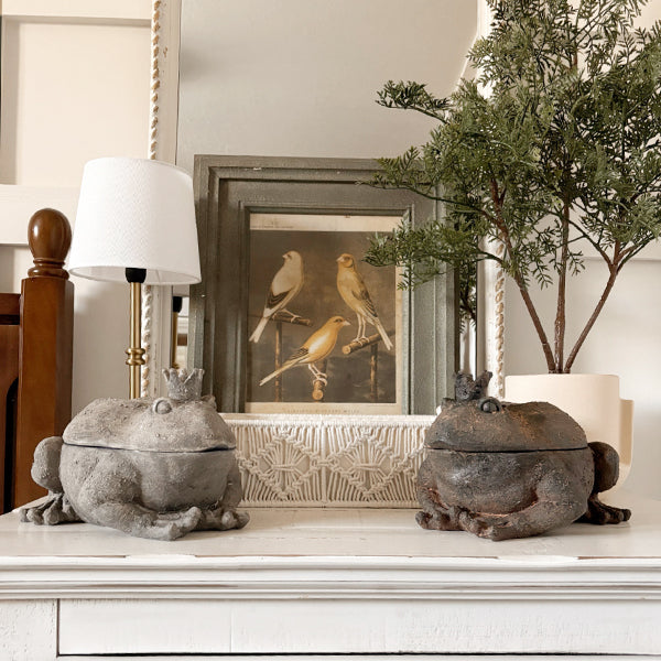 Prepare to hop into a world of whimsy with our Crowned Frog Mini Storage Box. Set of 2! These delightful sculptures are more than just decor—they're functional treasures. doubling as secret storage for your small essentials. Crafted with adorable details like tiny crowns and charming smiles. these plump little amphibian friends come in a rustic brown and elegant stone gray. perfect for bringing a touch of fairy-tale magic to your home. Whether perched on a bookshelf. nestled under a covered patio. or keeping watch on your desk. these regal frogs are guaranteed to spark joy and conversation. Who says royalty can't be absolutely adorable and fit in your budget? These little monarchs are here to rule your heart with their irresistible charm!