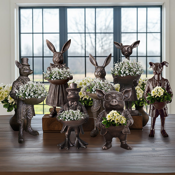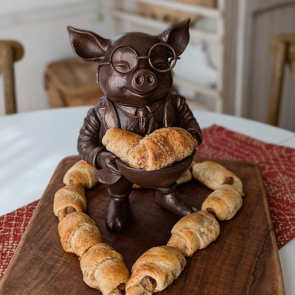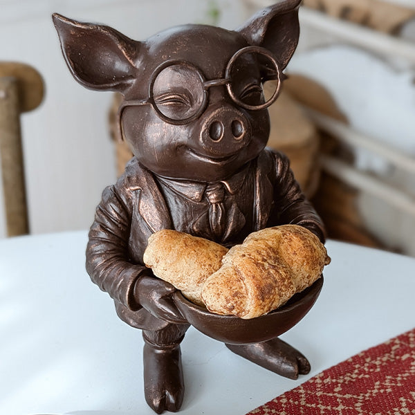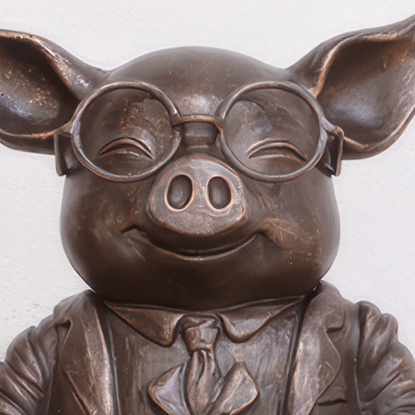 This brainy pig is ready to bring some serious style to your space. Standing proudly in his tailored suit jacket and perfectly knotted tie. complete with scholarly round spectacles. he's equal parts charming and clever. The rich bronze finish gives him that heirloom quality—like he's been presiding over a distinguished study for generations.