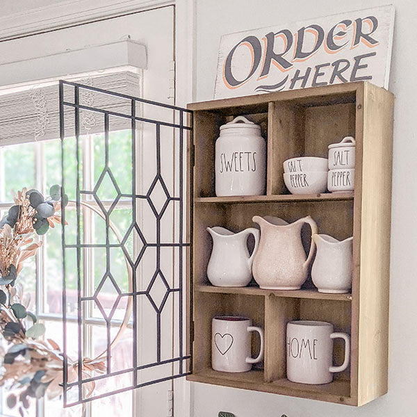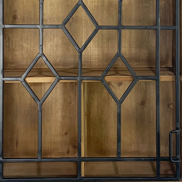 Our Decorative Curio Cabinet with Black Iron Door is farmhouse vintage at its finest! Made from distressed wood and metal framing. this cabinet is made to resemble old stained glass window frames. We LOVE that this particular style has an open style door with no glass... even easier to see all the treasures you display inside!