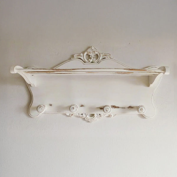 Four hooks on front for hanging dried flowers. jewelry. or your favorite linen sachets. Three wooden dowel rods for hand towels. scarves. or seasonal garlands. Plus a shelf on top for styling books. candles. or collected treasures. One piece. endless possibilities.