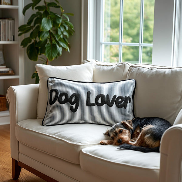 - "Dog Lover" embroidered in fancy cursive (because even pillows deserve good penmanship!)