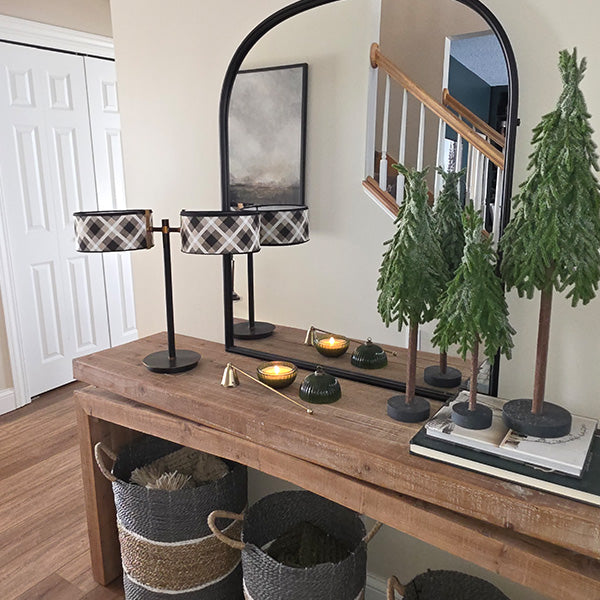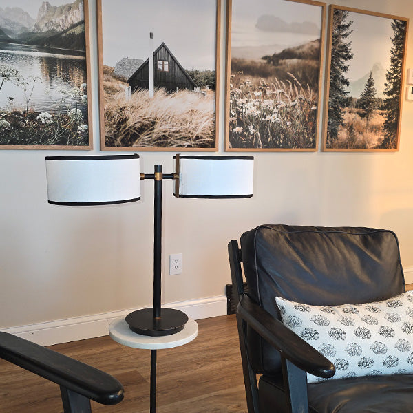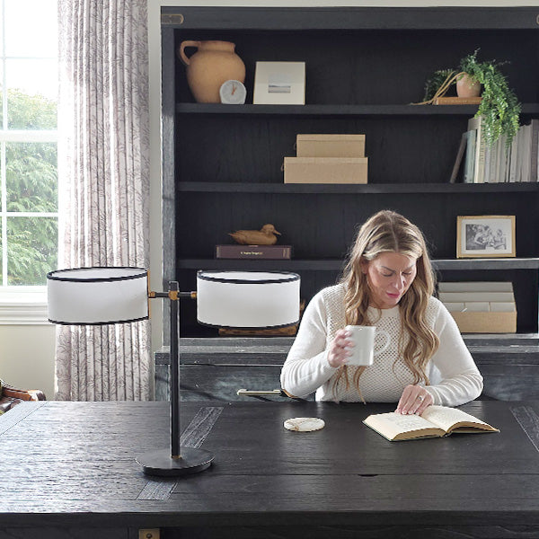Most table lamps give you a single shade and call it a day. This one arrives with two drum shades extending from a sleek black and brass accent cross-arm — creating the kind of balanced. editorial look you'd expect to pay serious designer prices for. Whether it's anchoring two chairs in a living room. commanding a console table. or lighting up a home office desk. it's a lamp that completely changes the room it's in.