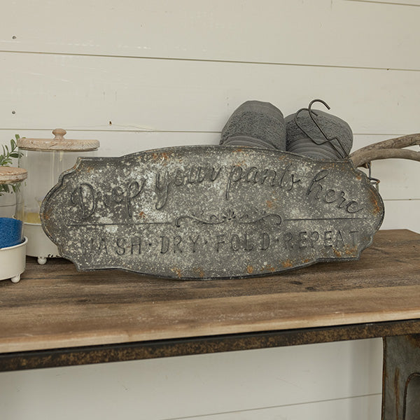 A stylish and charming décor piece. our Drop Your Pants Laundry Sign will be sure to bring humorous touch to your space. This old fashioned-inspired sign features a distressed finish with raised lettering and a LARGE size!