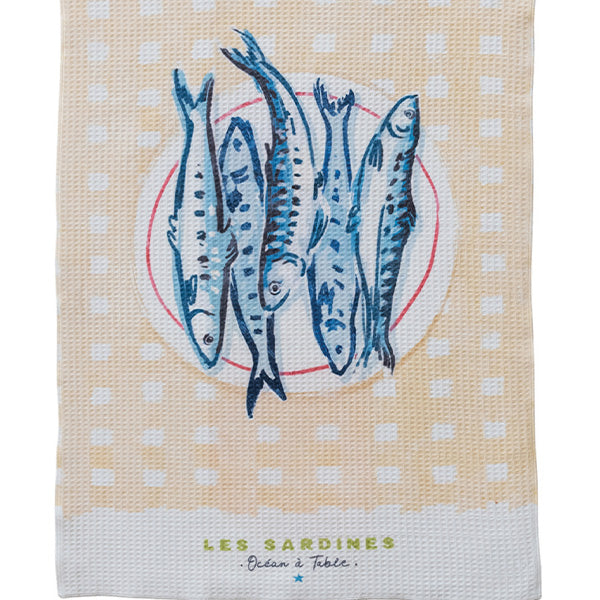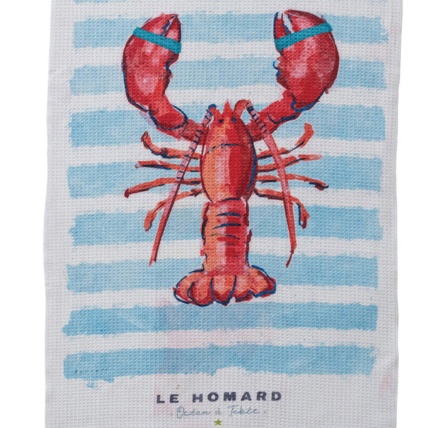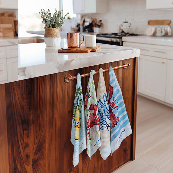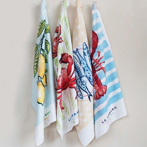 Transform your kitchen with this charming set of four French-inspired tea towels featuring coastal and Mediterranean motifs. Each 18" x 30" towel showcases beautiful hand-drawn illustrations including sardines (Les Sardines). red crabs (Le Crabe). fresh lemons (Citrons). and lobster (Le Homard) - all rendered in classic French styling with elegant typography.