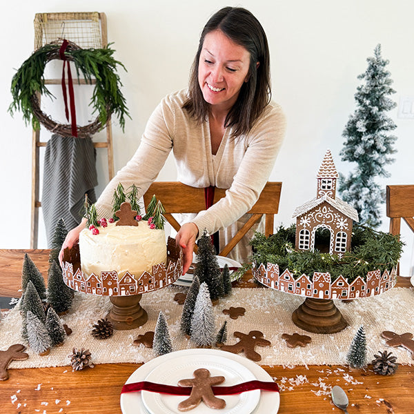 This gingerbread village tiered tray set transforms every holiday dessert into an absolute showstopper. Picture a chocolate cake surrounded by a charming village of hand-painted gingerbread houses that circle the base like the cutest little neighborhood you've ever seen. 🏠🍰 The warm brown wood tones make everything feel cozier. more special. more like the holidays you remember.