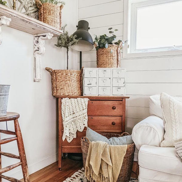 We love the use of these hyacinth baskets placed among your vintage themed fireplace. holding your favorite throw blankets and magazines for those cozy movie nights. Put these baskets in your laundry room to hold your detergents and sponges and instantly give the space a Farmhouse atmosphere... These are also great in the bathroom to hold larger toiletries and even in the kid's room to organize toys! The possibilities are always endless with Farmhouse baskets!