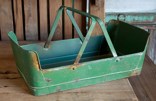 If you want a functional sturdy large Vintage Farmhouse look then this weathered aged green metal caddy is for you. Use this metal garden basket to bring that farmhouse touch to everything you do: