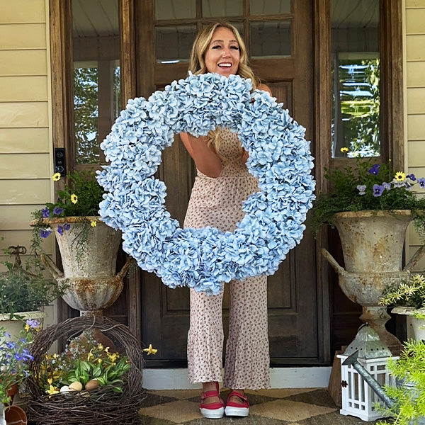 Meet the lifelike hydrangea wreath that's turning heads—and quickly disappearing from our shelves! This breathtaking blue hydrangea beauty brings cottage garden magic straight to your front door. but you'll need to act fast—we're almost out of stock!