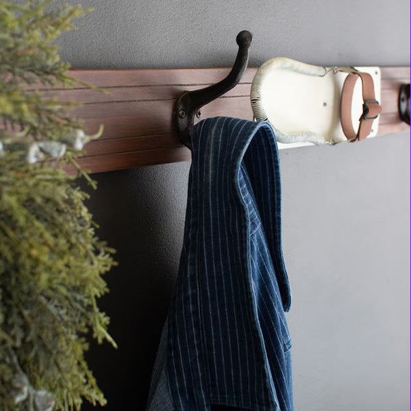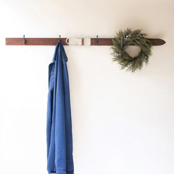 This isn't your standard Home Depot coat rack. Crafted from natural wood with the distinctive shape and character of a vintage ski. this 67-inch beauty brings personality to any space. The warm wood tones paired with four sturdy black metal hooks create that perfect balance of rustic charm and everyday functionality.
