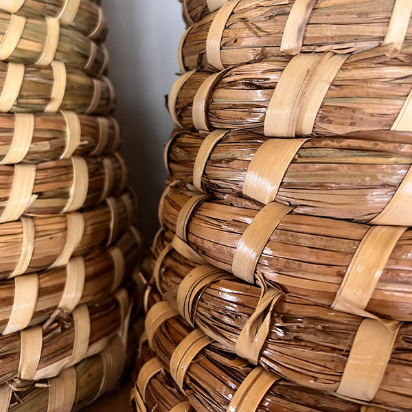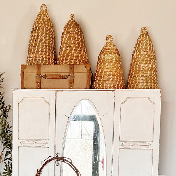 Celebrate the beauty of traditional craftsmanship with these Handwoven Natural Palm Bee Skep Cloches. Woven from natural palm leaves. these rustic cloches bring farmhouse charm to any space while serving as decorative accents. Inspired by classic bee skeps. they add warmth. texture. and a touch of history to your home or outdoor setting. Avoid the FOMO—get them while they're still available!