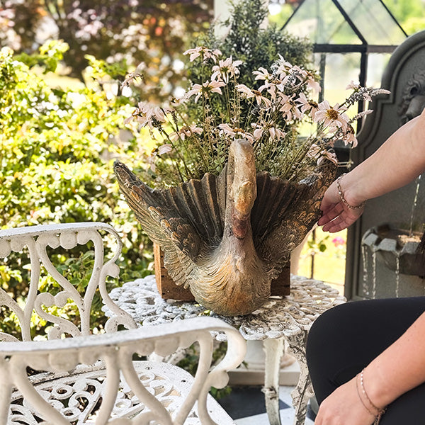 Add a graceful touch of garden charm to your porch or patio with our Enchanted Swan Garden Planter. More than just a decorative accent. this swan doubles as a functional planter. offering both beauty and purpose in one elegant design. With a vintage-inspired distressed finish and waterproof construction. it's ready to weather the seasons while showcasing your favorite blooms in style.