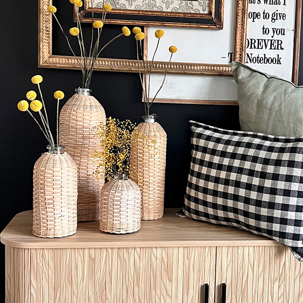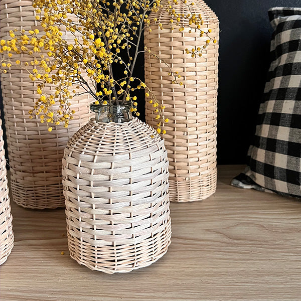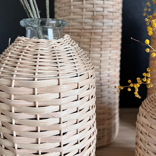Perfect for adding a natural touch to your home. this set of rattan-wrapped glass vases is a must-have for those who love effortless. stylish decor. Whether grouped together or spread throughout your space. they bring warmth and texture to any room.