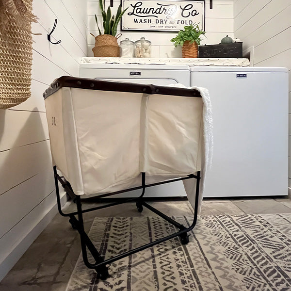 Designed for ultimate convenience. this rolling laundry basket simplifies sorting and transport. With two divided sections. you can easily separate lights and darks. or keep each family member's laundry neatly organized. The rolling wheels make trips to the laundry room effortless. even with a full load.