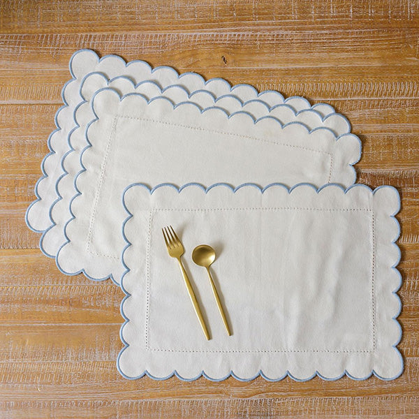 Transform everyday meals into special occasions with this charming scalloped table linens collection. Choose between delicate hemstitch placemats with scalloped blue trim or sophisticated blue gingham napkins with scalloped edges—or mix both for a perfectly curated cottage-inspired tablescape. Made from soft cotton. these aren't the stiff. formal linens that only see daylight on holidays. They're practical enough for daily use while bringing French country sophistication to every meal.