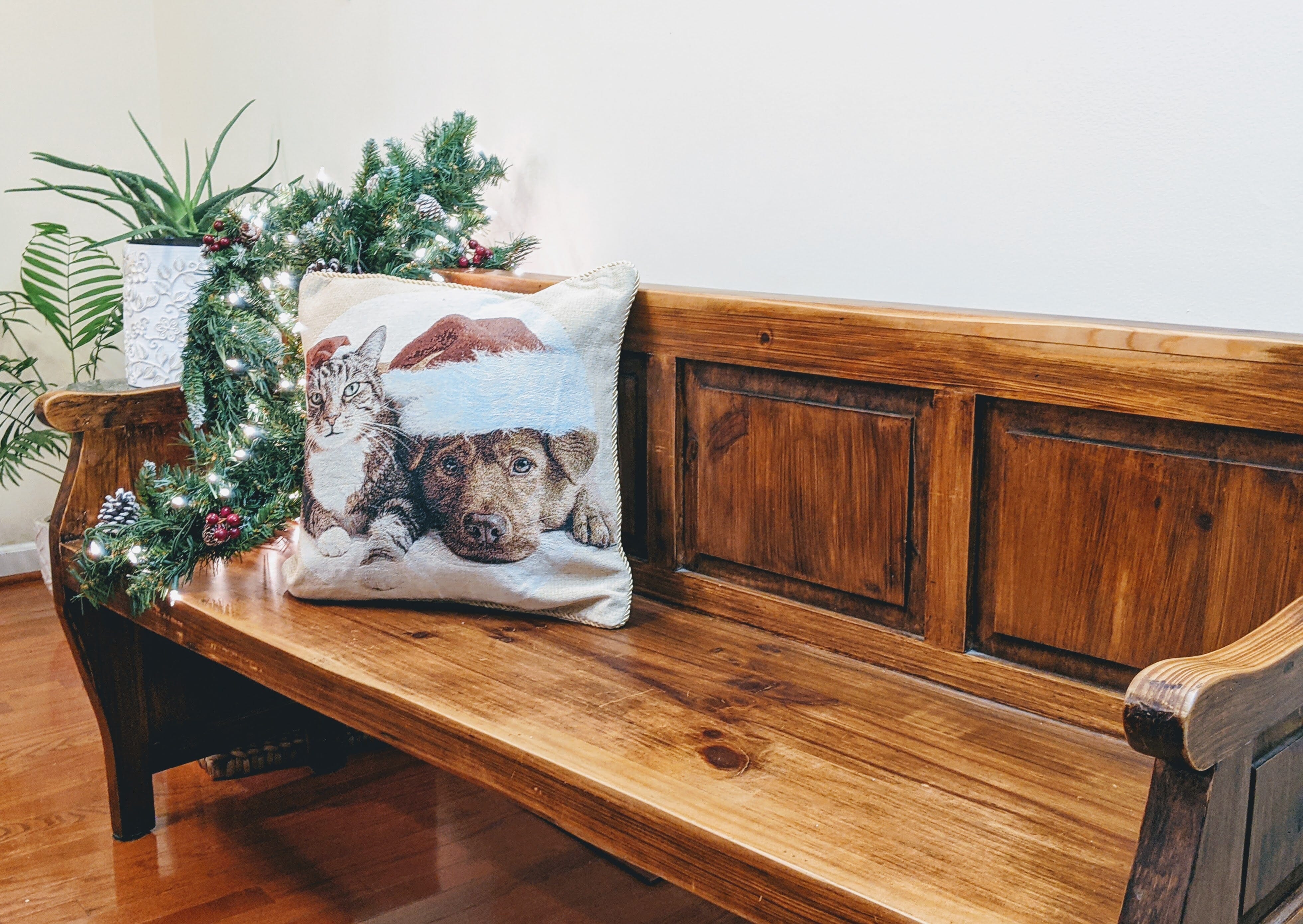 Join these two cuties in bringing in the Holiday Season The Soulful eyes of the dog and cat with their Santa Claus Hat beg for a new Home With you!. Great for Pet lovers. The front of the pillowcase is a strong. firm upholstery fabric that will take the wear and tear of a room where people live. The back of the pillow is a soft tan fabric. The whole case is edged in a gold cord which gives it a feeling of elegance. Perfect to bring a festive atmosphere to your home. Crafted with fine detail and vibrant colors. this pillow cover showcases a traditional folk art aesthetic. Simply slip it over your existing pillow insert to instantly liven up any couch. chair. or bed with a touch of Christmas cheer. The tapestry material provides a cozy. inviting texture that's perfect for snuggling up during the winter months. Whether as an accent piece or a fun holiday gift. this charming pillow cover is sure to delight pet lovers and spread holiday joy.