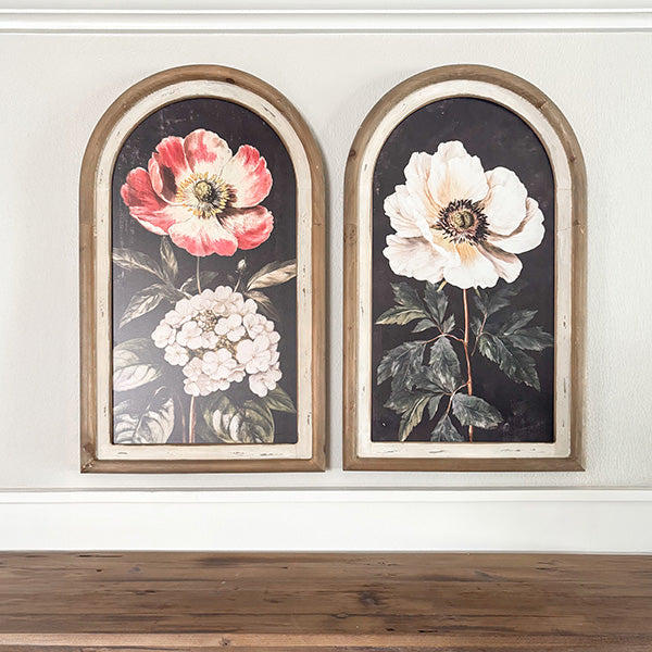 This thoughtfully designed set features vibrant coral blooms. creamy white florals. and lush greenery layered against a rich. moody black background. Finished with distressed arched frames. it delivers that timeless farmhouse charm that works beautifully in kitchens. entryways. dining rooms. and beyond—making it a standout statement without overpowering your space.