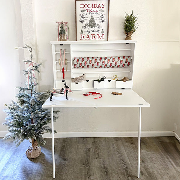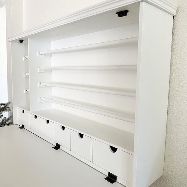 - Convertible Design: Easily converts from a wall-mounted cabinet into a spacious table surface for wrapping and crafting. The front door/cover hinges down and locks in place to provide a sturdy work area.