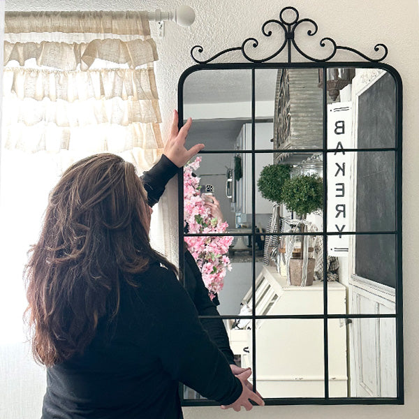 Designed to mimic the charm of an old-world window. the Black Rectangular Windowpane Mirror features a stunning grid design and an ornate wrought iron scrollwork top. creating a striking focal point for any room. Whether you're looking to brighten up your entryway. living room. or hallway. this piece blends timeless sophistication with functional decor.